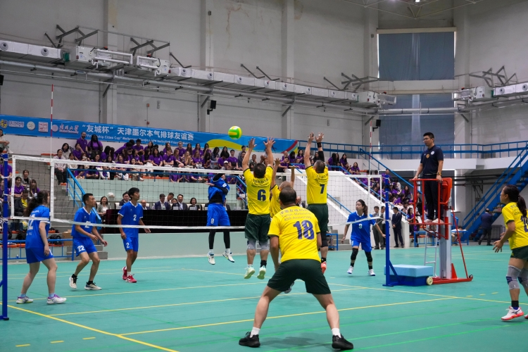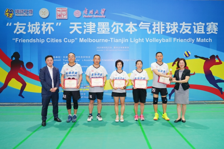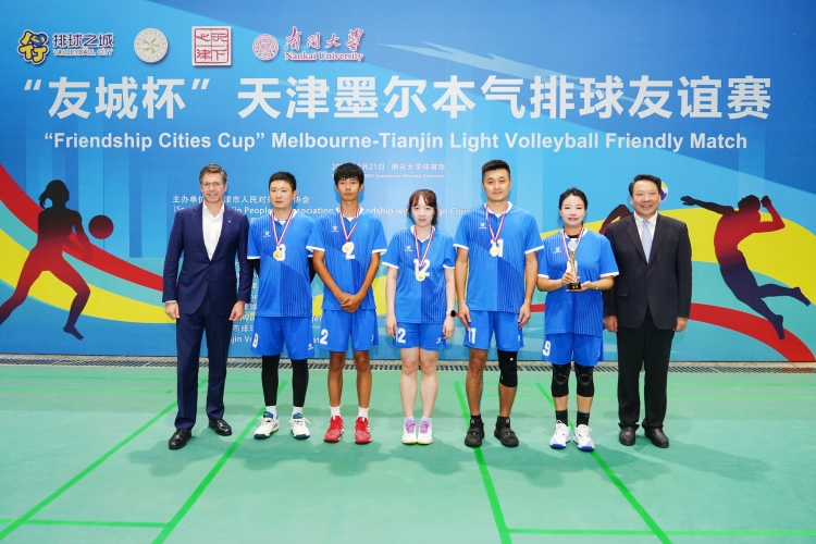 After the speech, Chen and Reece attended the finals and award ceremony of the Friendship Cities Cup Melbourne-Tianjin Light Volleyball Friendly Match at the Gymnasium on Balitai Campus, jointly presenting trophies to the champion team and medals to participating athletes.