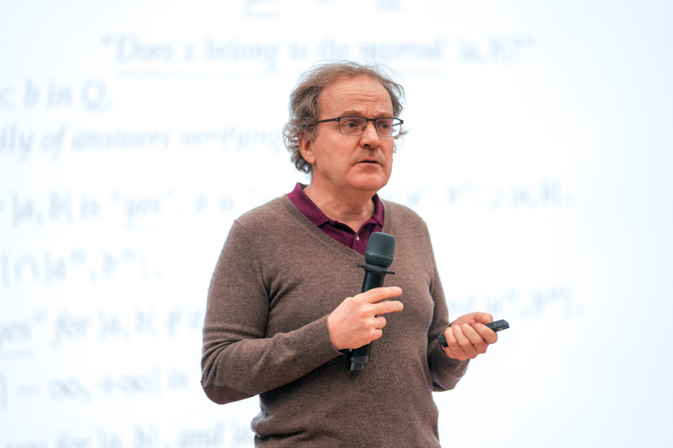 In his lecture, Prof. Lafforgue proposed a novel perspective: A real number can be viewed as a logically self-consistent Q&A system about “whether a number falls within a specific interval.” Much like guessing a number by progressively narrowing its range, this process uniquely determines the number itself. By introducing concepts such as covering and Grothendieck topologies, he explored the notion of “points” on more general sets. In this framework, a “point” is no longer the familiar dot but rather a “rule interpreter” capable of decoding the entire structure of the space. Through a rigorous system of correspondences, it translates complex mathematical objects into comprehensible set-theoretic information.