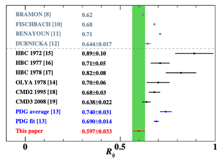Based on electron and positron annihilation data at center-of-mass energies between 4.178–4.226 GeV, the BESIII collaboration measured the branching fraction of D_s^+ → ϕπ^+, ϕ→K_S^0 K_L^0 through an amplitude analysis of D_s^+ → K_S^0 K_L^0 π^+. The analysis yields R_ϕ = 0.593 ± 0.023(stat) ± 0.014(syst) ± 0.016(ϕπ), which deviates from the world average value by more than three standard deviations. This result will have a significant impact on the foundational inputs for studies related to non-perturbative QCD, the structures of hadronic matters, and CP violation. The figure below shows the invariant mass projections from the amplitude analysis and comparison of R_ϕ result. The figure below presents the invariant mass projections from the amplitude analysis and a comparison of the R_ϕ results.