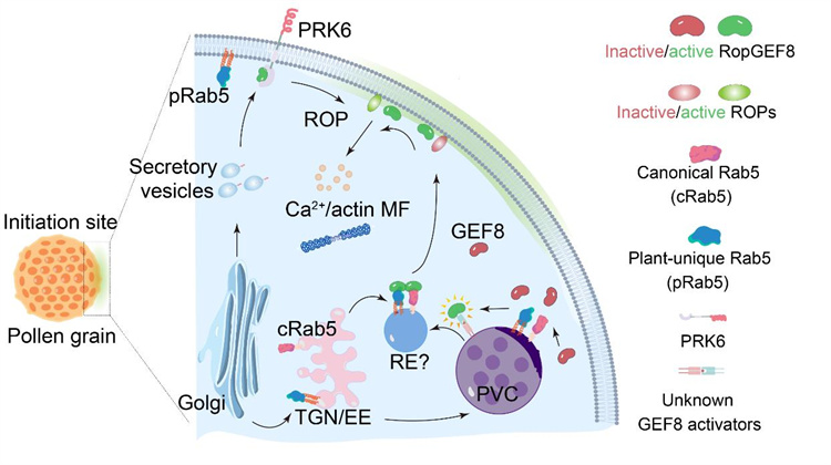Pollen germination is the critical first step in the reproduction of flowering plants. Much like a seed sprouting, the pollen grain must determine the precise direction to extend a pollen tube. How this initial symmetry-breaking event occurs—transforming a non-polar cell into a polar one—has long remained a fundamental mystery in plant reproductive biology. This study focused on the core signaling molecules regulating this process: ROP GTPases. The research team, led by Professor Zhang Yan, has identified Rab5 GTPases as the key navigators in this process. In a groundbreaking discovery, the study demonstrates that non-polarly localized Rab5 proteins recruit the ROP activator RopGEF8 through direct physical interaction. This mechanism ensures the precise delivery of signaling molecules to specific sites on the pollen cell membrane, thereby triggering the polarity establishment required for germination.