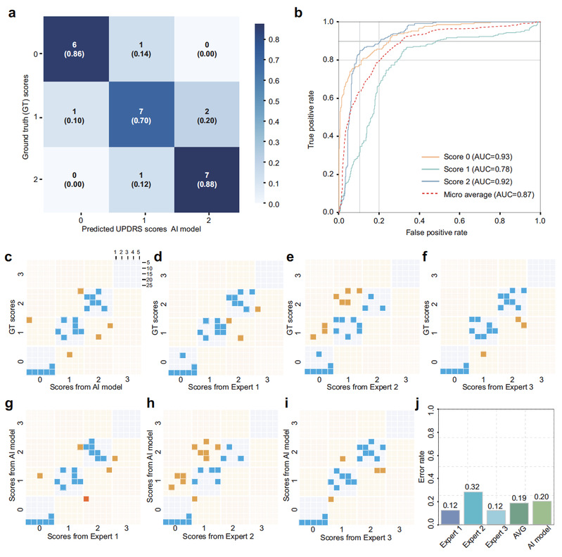 In assessing gait impairment severity, clinical tests on an independent test set (25 participants) demonstrated that the AI model performed comparably to clinical experts. The model achieved an F1 score of 0.806, which is close to the average score of three clinicians (0.819). Its assessment error rate (0.20) was also nearly identical to the clinicians average error rate (0.19) (Figure 3).