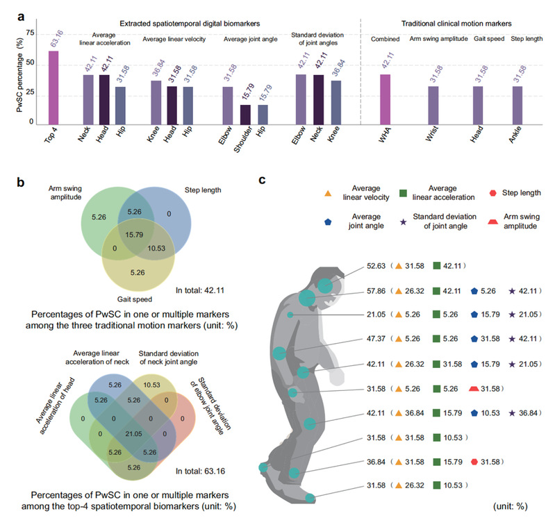 In discovering digital biomarkers for Parkinson’s disease gait impairment, the team utilized the proposed interpretable framework to extract multiple novel digital biomarkers that are more sensitive to disease progression and medication response. For example, the study found that the average linear velocity of the ankle joint is more sensitive in reflecting disease severity than traditional arm swing amplitude. In medication ON-OFF tests, 63.16% of patients showed significant differences in new biomarker indicators (e.g., linear acceleration of the neck and head), whereas only 42.11% exhibited significant changes in traditional movement biomarkers (Figure 5).