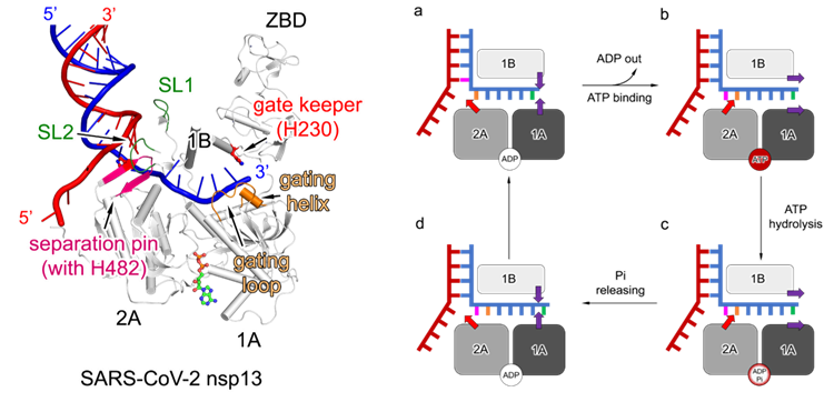 Fig. 3. Left: Key structural elements of the SARS-CoV-2 helicase. Right: Schematic model of double-stranded RNA unwinding driven by ATP hydrolysis.