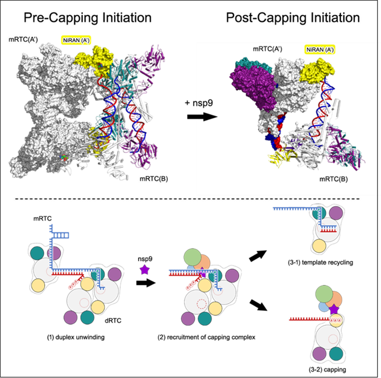 With a focus on the coronavirus transcription and replication process over the past five years, the research team has successively elucidated the working mechanisms of C-RTC, E-RTC, Capping Intermediate Complex, and Cap0 Capping Complex. Building on this foundational work, they designed a series of novel nucleic acid scaffolds and successfully captured two super-complexes—the Pre-Capping Initiation (Pre-CI) and Post-Capping Initiation (Post-CI) states of the transcription-replication complex. This finding elucidated the molecular mechanism by which RNA template recycling and RNA capping initiation occur synergistically (see Fig. 1).