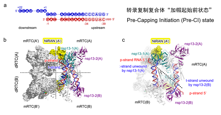Fig. 2. (a) The RNA scaffold used for assembling the Pre-CI complex. (b) Overall architecture of the Pre-CI complex in its tetrameric form. (c) Unwinding of the “template-product” double-stranded RNA within the Pre-CI complex.