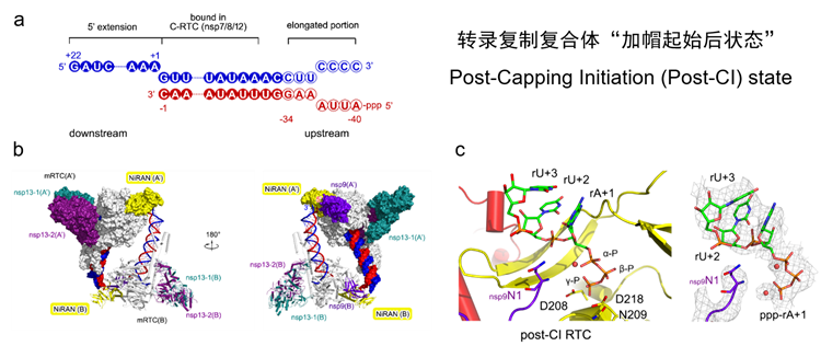Fig. 4. (a) RNA scaffold used for the assembly of the Post-CI complex. (b) Overall architecture of the Post-CI complex. (c) Co-localization of the RNA product strand 5’-triphosphate group with the nsp9 protein at the catalytic center of the NiRAN domain within the Post-CI complex