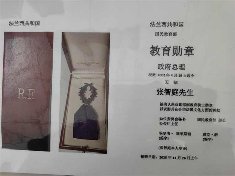The Ordre des Palmes Académiques stands as the highest honor in Prof. Zhang’s career. The accompanying certificate, bearing the endorsement of the then Prime Minister of France and the signature of the Minister of National Education, represents the French government’s official recognition of Prof. Zhang’s contributions to cultural exchanges between China and France. Prof. Zhang expressed his hope that the medal he donated to NKU Archives would play a positive role in shaping the distinctive campus culture at NKU, inspiring future generations of scholars, carrying forward the rich legacy of the discipline, and promoting cultural dialogue.