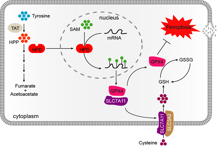 On November 29, the research group led by Changliang Shan at the College of Pharmacy, Nankai University (NKU), published a paper in Advanced Science with the title HPD is an m⁶A Methyltransferase that Protects Colorectal Cancer Cells from Ferroptotic Cell Death by m⁶A Methylating SLC7A11/GPX4. In this study, Shan Group discover the tyrosine metabolism enzyme 4-hydroxyphenylpyruvate dioxygenase (HPD) as a methyltransferase responsible for m6A modification. Unlike METTL3, which requires the assistance of METTL14 to form a complex and exert methyltransferase activity. Interestingly, we reveal that HPD has a catalytic domain (CMI) like METTL3. Moreover, HPD recruits the universal cofactor S-adenosylmethionine (SAM) to the substrate binding center as a methyl group donor. In particular, we demonstrate that HPD regulates colorectal cancer ferroptosis by methylating SLC7A11/GPX4 through a moonlighting function. These findings uncover the moonlighting function of HPD in m6A-mediated ferroptosis and underscore the potential to target the m6A methyltransferase activity of HPD for cancer treatment.