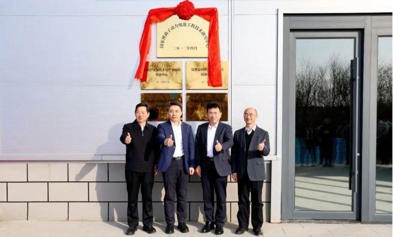 Chen Jun, Lu Tianjun, Qin Xingcai, and Huang Yunhui jointly unveiled the plaque for the new location of the National Engineering Research Centre for Lithium-ion Power Batteries. The National Engineering Centre showcased a number of collaborative innovation achievements.